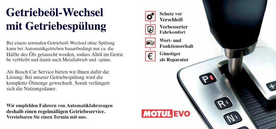 Als Bosch Car Service bieten wir Ihnen dafür die Lösung: Bei unserer Getriebespülung wird die komplette Ölmenge gewechselt. Somit verlängert sich die Nutzungsdauer.