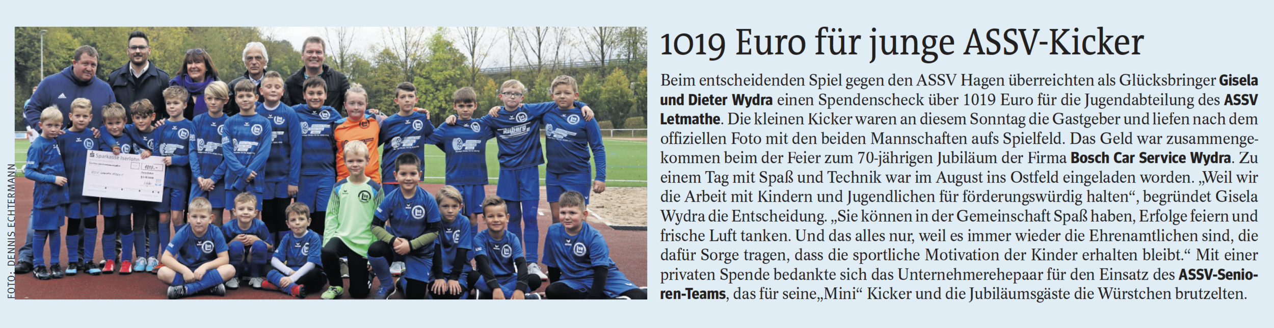 13. November 2019 - Gisela und Dieter Wydra überreichen einen Spendenscheck über 1019 Euro für die Jugendabteilung des ASSV Letmathe.
